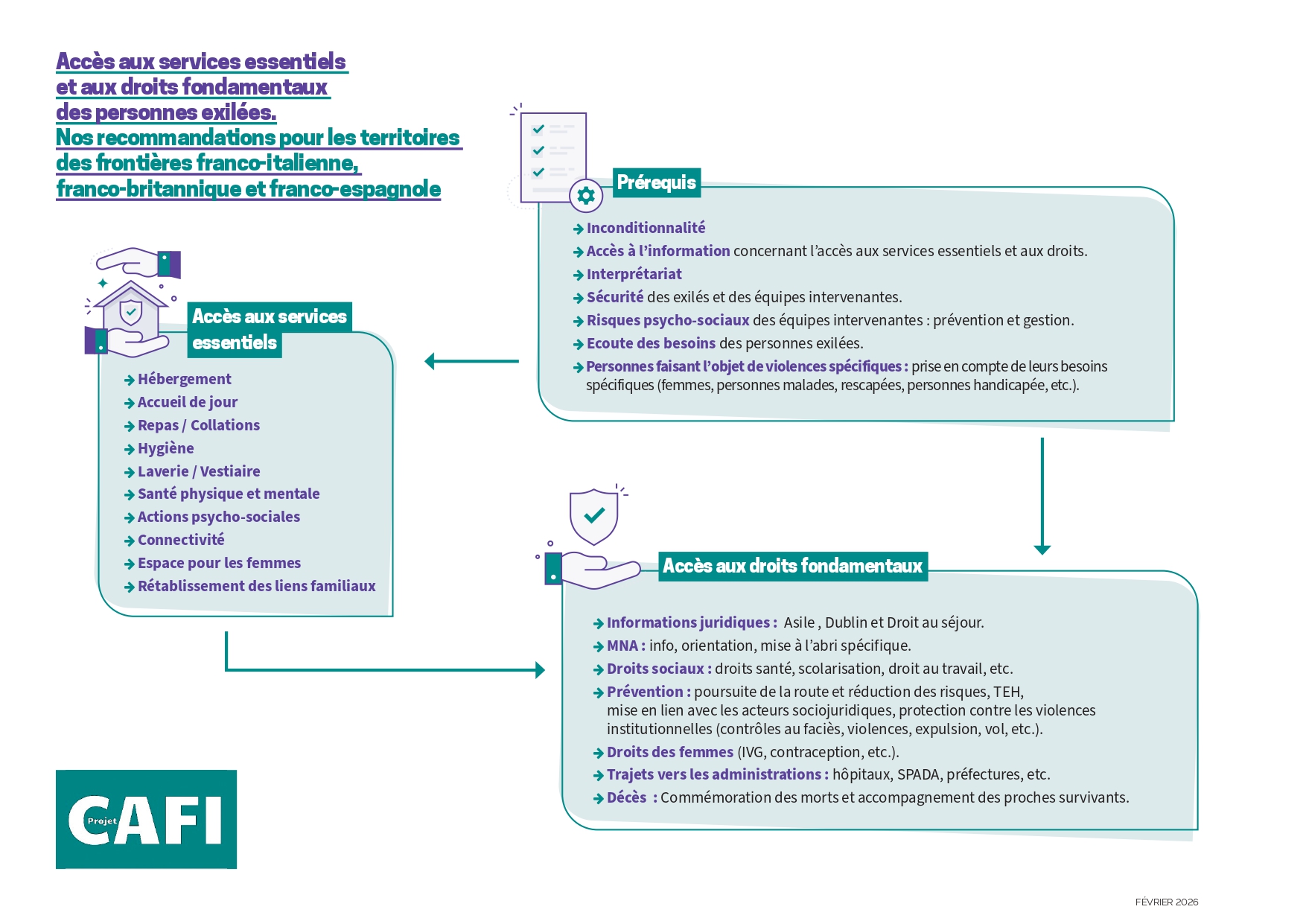 L’accès aux droits fondamentaux et services essentiels aux frontières, en construction avec les acteurs locaux et nationaux compétents.